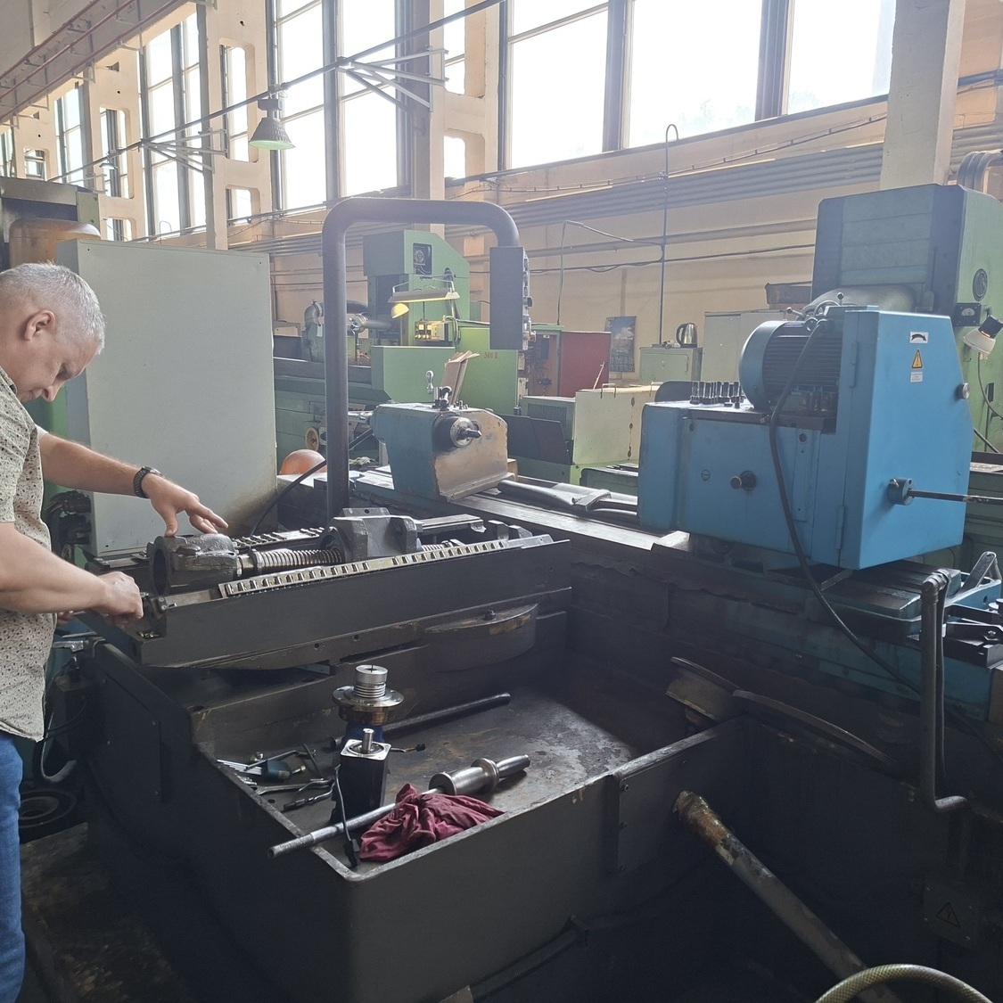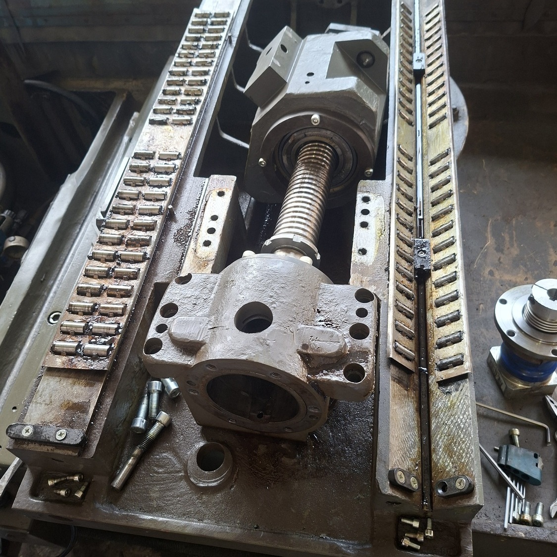 В первую очередь провели полную разборку станка для дефектовки. После проведения дефектовки было принято решение по замене всех подшипников шпинделя, коробки скоростей, ШВП продольной и поперечной подачи, шабрение направляющих. Произвели регулировку натяга "Винт-Гайка" ШВП. Также была произведена замена всей системы центральной смазки, включая насос, трубки подачи масла и питатели. Далее последовала шабровка направляющих с проверкой по лекальной линейке и изготовление новых кожухов, а также пульта управления.